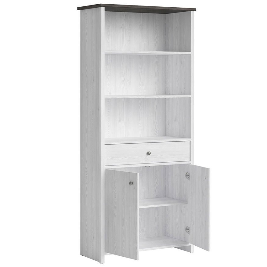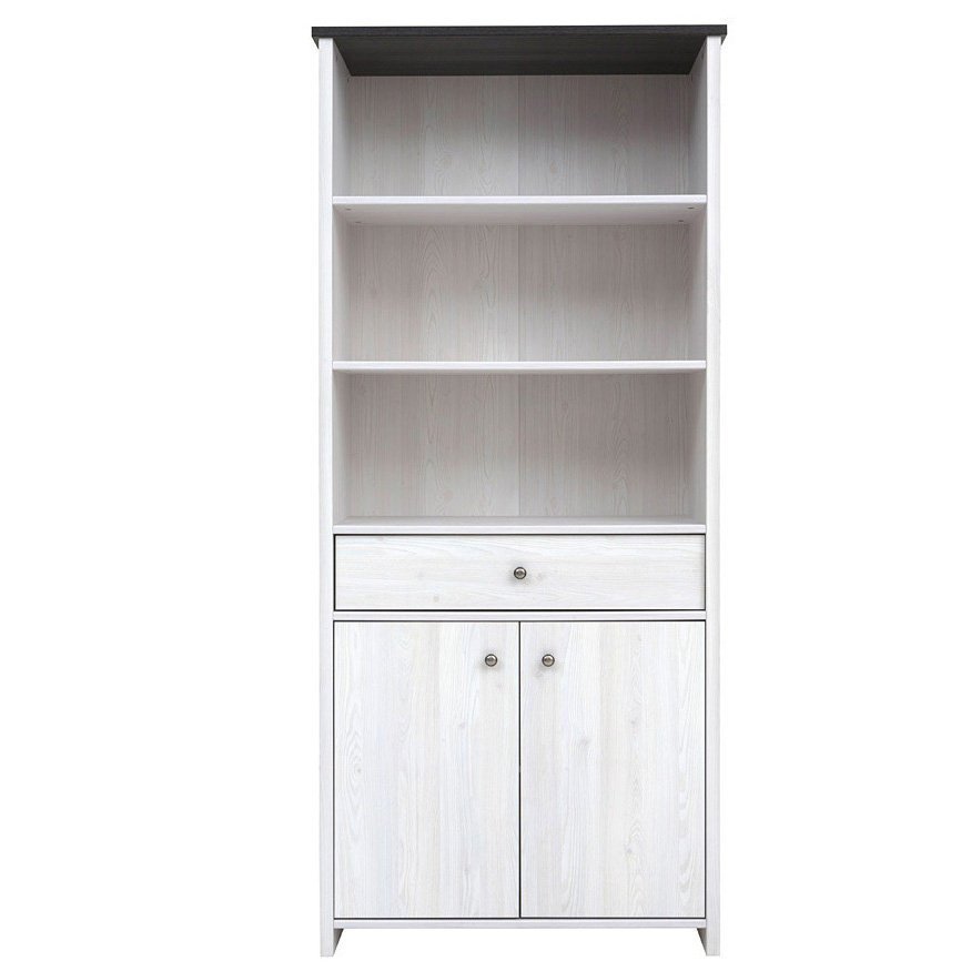 Стеллаж содержит один выдвижной ящик, три открытых и одно закрытое отделение с полкой внутри. Оборудован небольшими круглыми металлическими ручками серебристого цвета. Используются петли Hettich и роликовые направляющие.