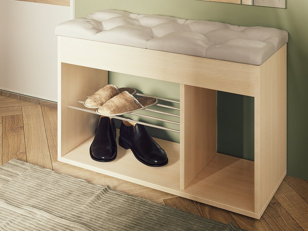 Удобный мягкий элемент и открытые ячейки делают её идеальной для небольшой прихожей. Основные ниши предназначены для кроссовок, туфель и тапочек, боковая же ниша — для более высокой обуви. А под откидной верхней крышкой — ниша для перчаток, зонтика, крема для обуви или других полезных мелочей, необходимых при выходе из квартиры.