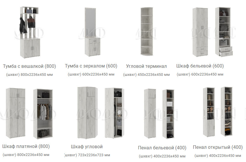 Цена за комплект: Тумба с вешалкой, Тумба с зеркалом, Угловой терминал, Шкаф угловой, Пенал бельевой
