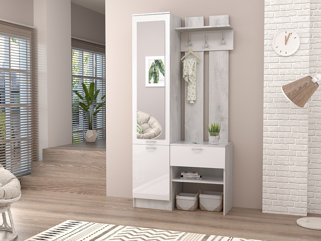 Прихожая имеет простой дизайн и прямые формы. Она состоит из вешалки с тумбой и пенала. Открытая вешалка оборудована полкой для головных уборов, тремя 3-х рожковыми крючками для одежды, ниже выдвижной ящик на роликовых направляющих, под ним открытая ниша с полкой. За распашными дверьми пенала три полки. Тип сборки и направление открытия дверей определеяется при сборке.