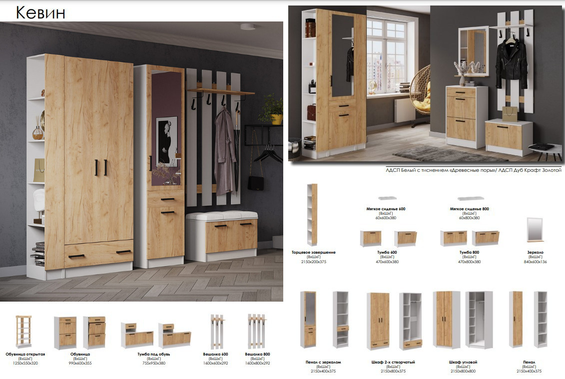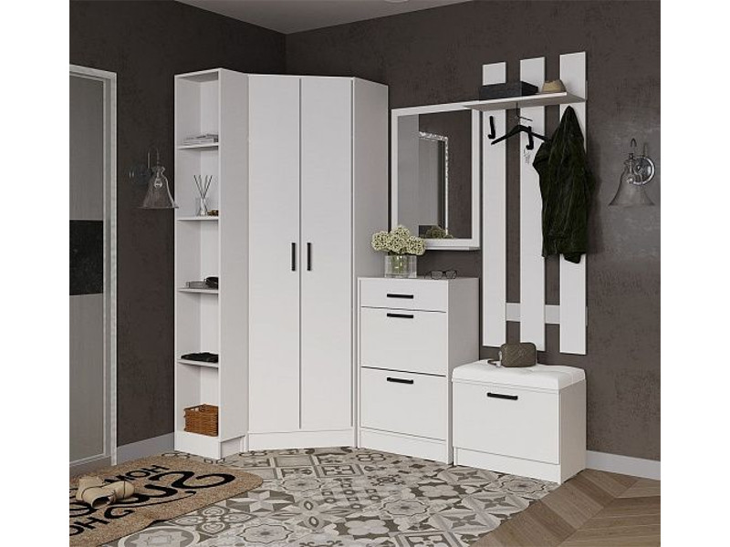 Цена за комплект: Торцевое завершение, Шкаф угловой, Зеркало, Обувница, Вешалка 600, Тумба 600, Сиденье мягкое 600