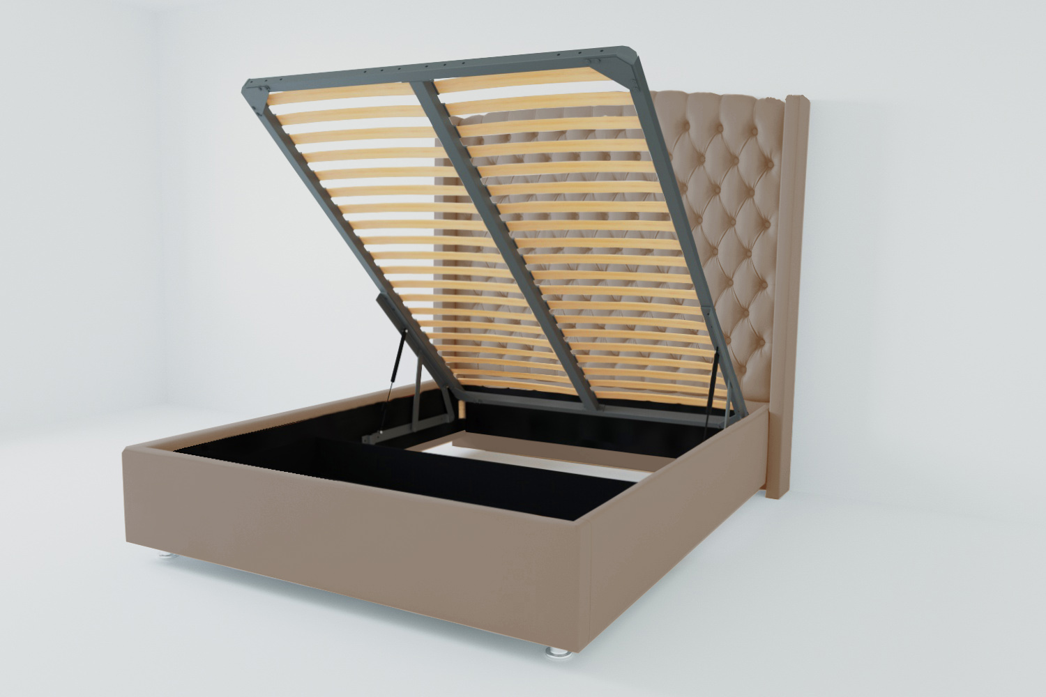 Короб для белья установлен в нижней половине кровати, ее верхнюю половину занимает подъемный механизм.