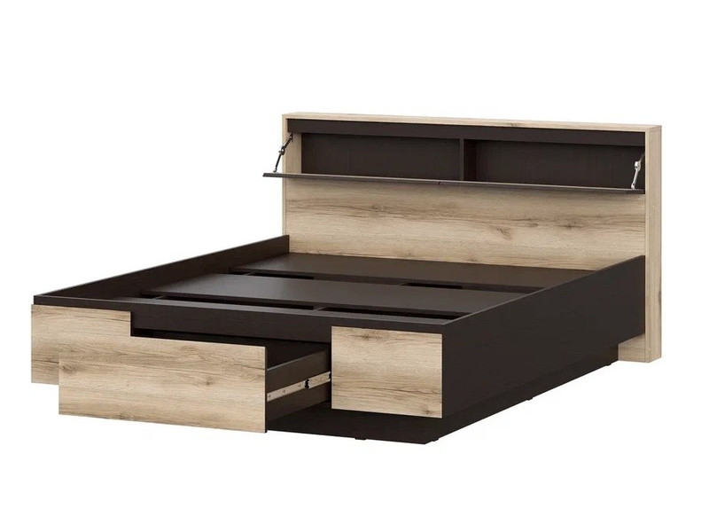 Массивное изголовье оборудовано двумя скрытыми ящикам с откидными створками для хранения необходимых в зоне сна предметов.