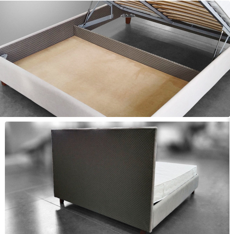 Кровать имеет подъемное ортопедическое основание и короб с дном из МДФ.