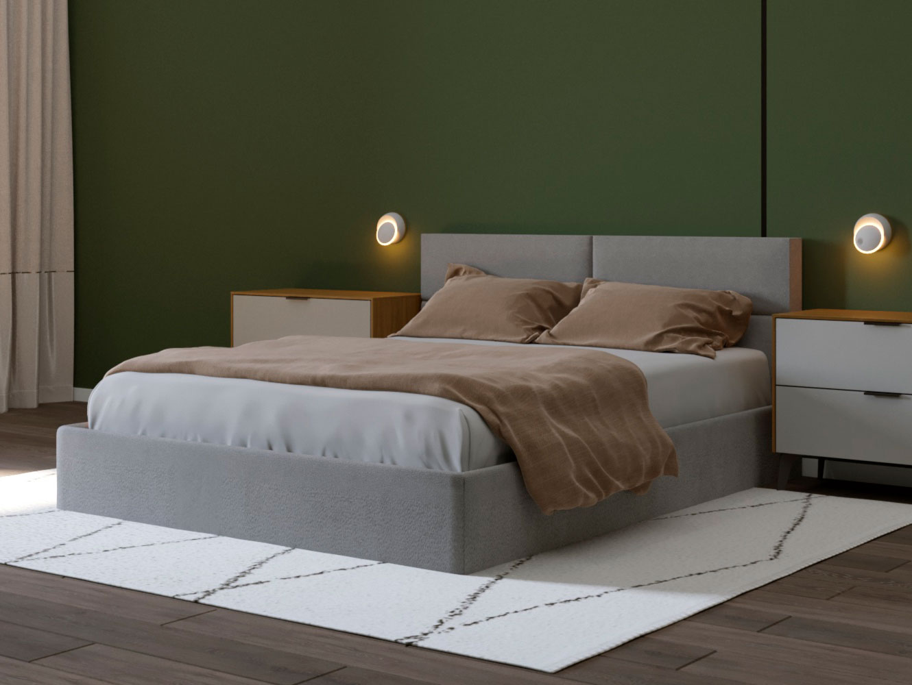 Изголовье: Изголовье состоит из нескольких панелей, красиво оформленных с эффектом стежки. Это не только эстетически приятно, но и обеспечивает комфортную поддержку для спины, что делает кровать удобной для чтения или отдыха.