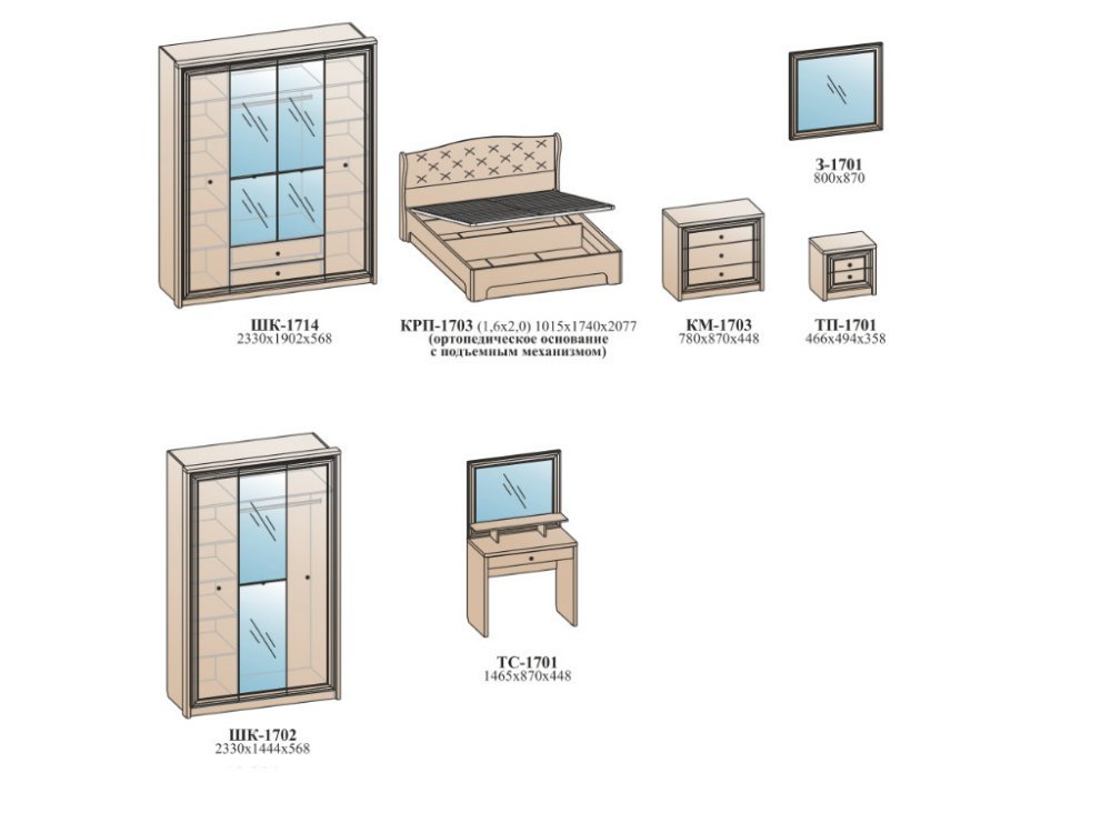 Цена указана за комплектацию на главном фото: (ТП-1701) Тумба прикроватная 2 шт, (КР-1702) Кровать (1400*2000мм) с ортопед.основанием, (ШК-1702) Шкаф