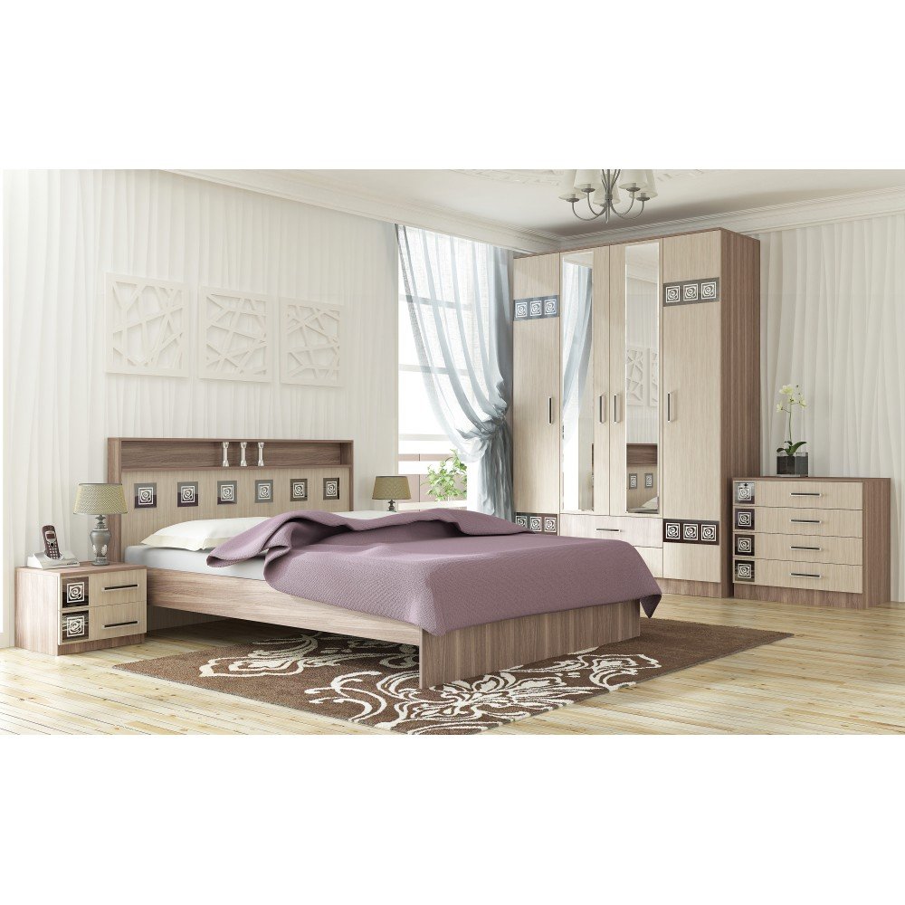 Цена указана за комплектацию на главном фото (кровать 1200 мм, 2 прикроватные тумбочки, шкаф 4 створчатый, комод)