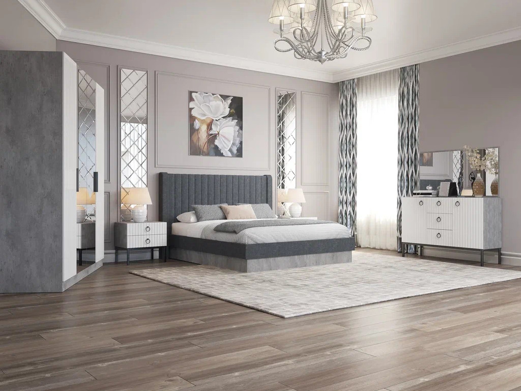 Цена за комплект: Каркас шкафа 4 дв, Двери глухие (2шт), Двери с зеркалом (2 шт), Кровать (1600) с ПМ, Тумба (2шт), Комод, Зеркало