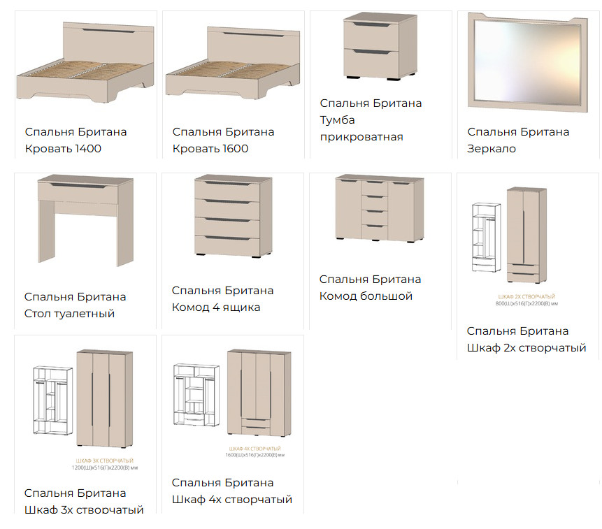 Цена указана за комплектацию: Кровать 1400, Комод 4 ящика, умба прикроватная, Зеркало, Стол туалетный, Шкаф 4х створчатый