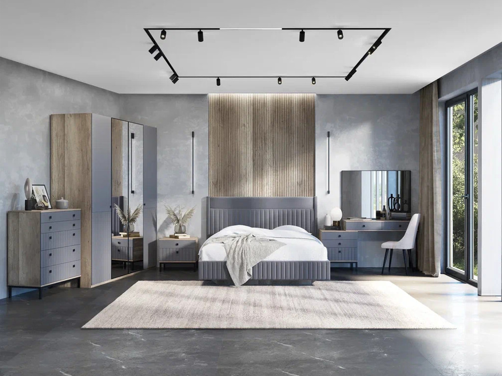 Цена за комплект: Тумба, Кровать (1600), Шкаф 4 двери (зеркало), Зеркало, Стол туалетный, Комод 5 ящиков