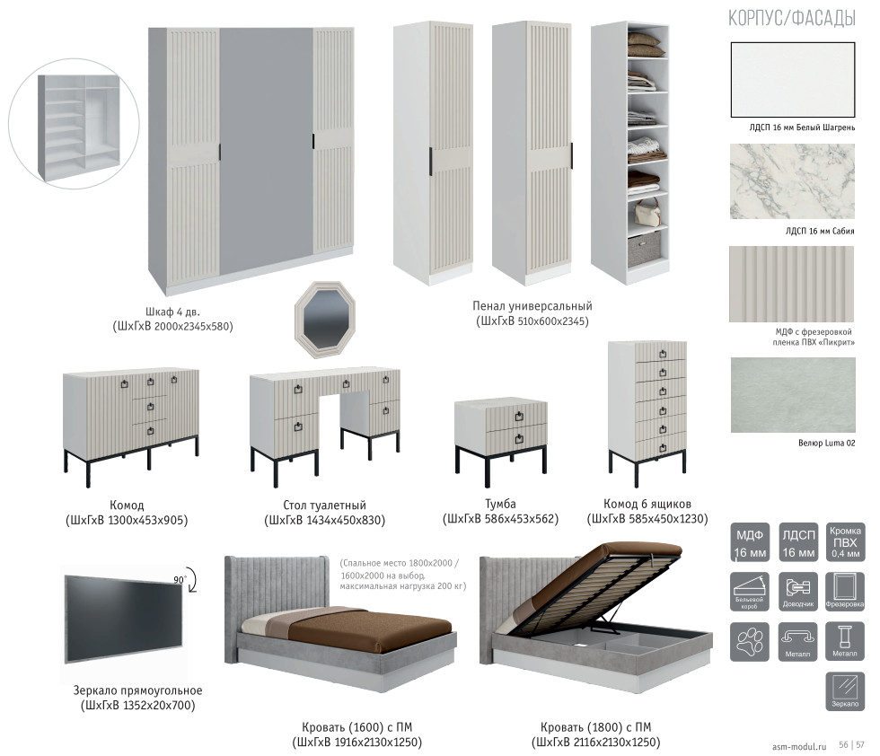 Цена за комплект: Кровать (1600), Тумба, Стол туалетный, Комод, шкафа 4 двери, Двери глухие 4 шт