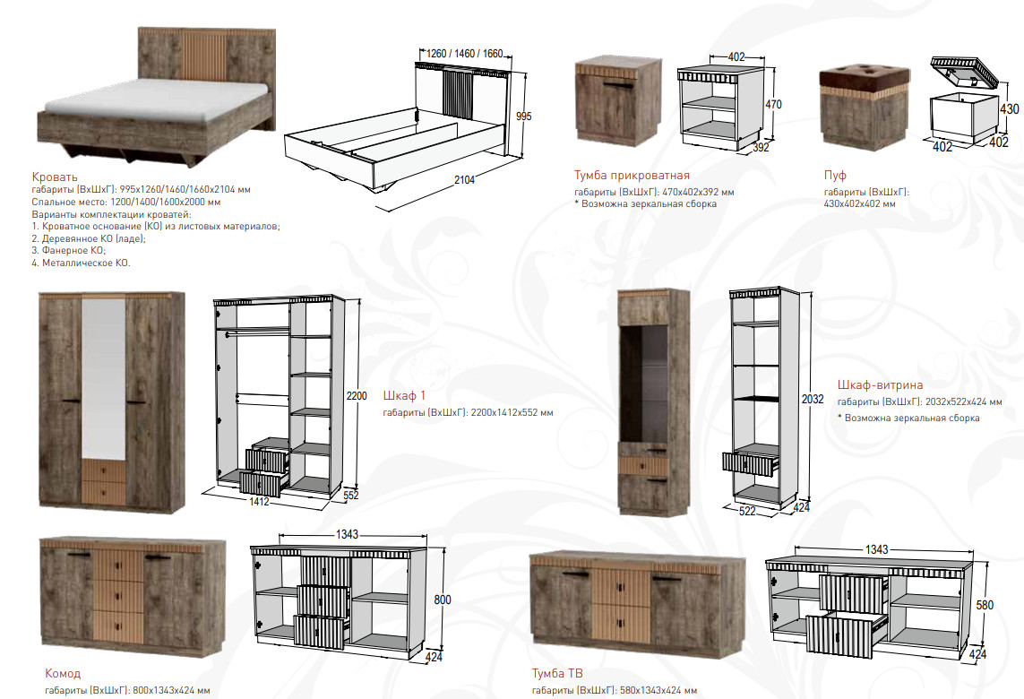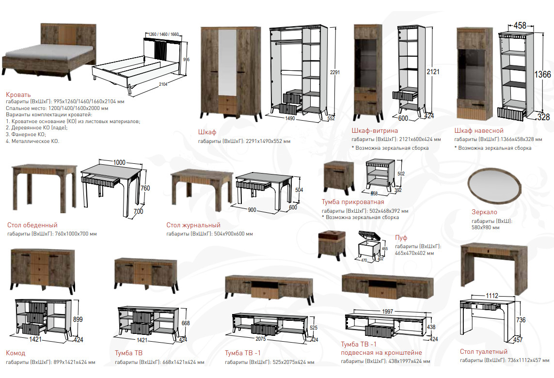 Цена за комплект: Зеркало, Комод с ножками, Кровать с ножками 1200, Деревянное кроватное основание (1200), Шкаф трехдверный с ножками, Тумба прикроватная с ножками (2шт)