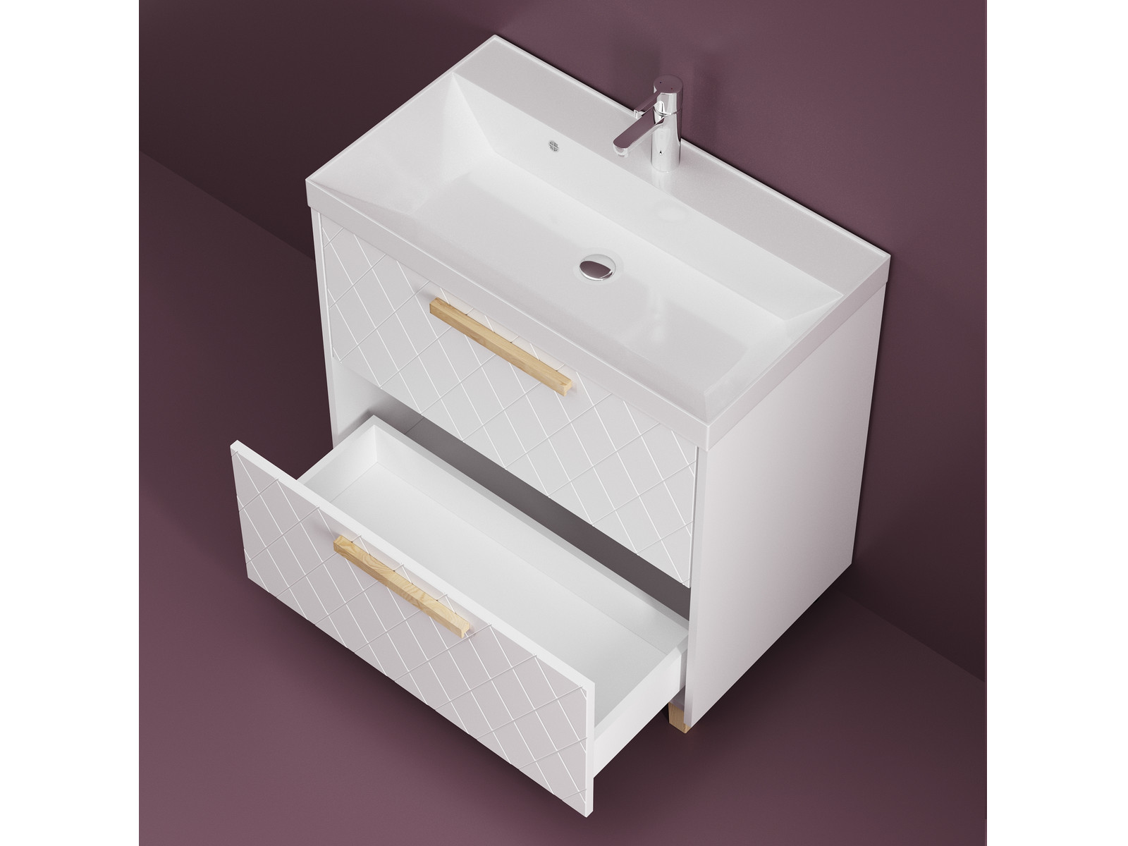 - Тумба Кристалл 80 напольная 2 ящика ручка дуб, раковина Слим 80 Суфле