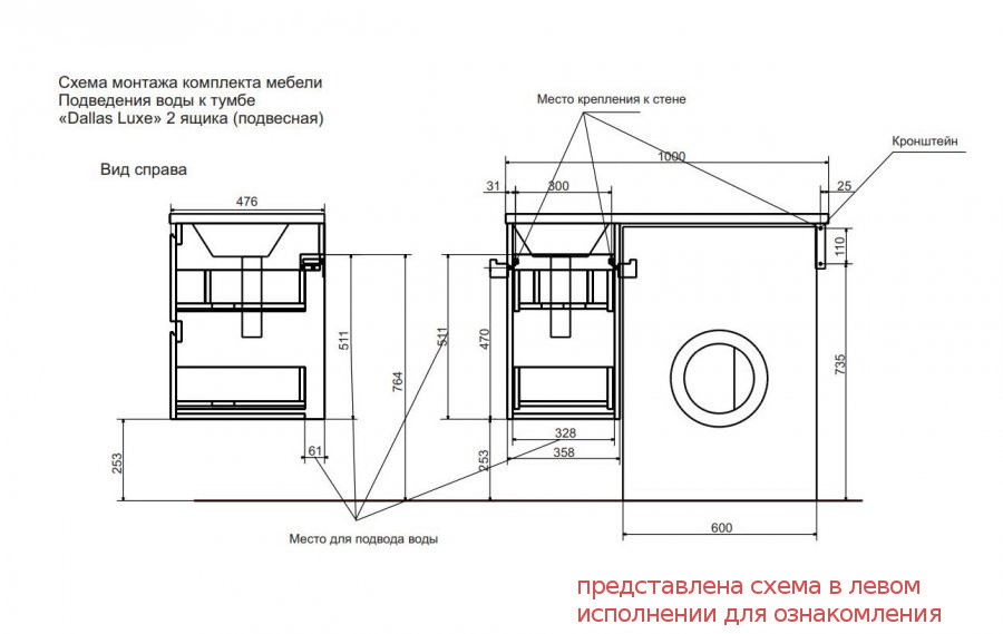 - Тумба с раковиной Dallas Luxe 1000 навесная 2 ящика правая