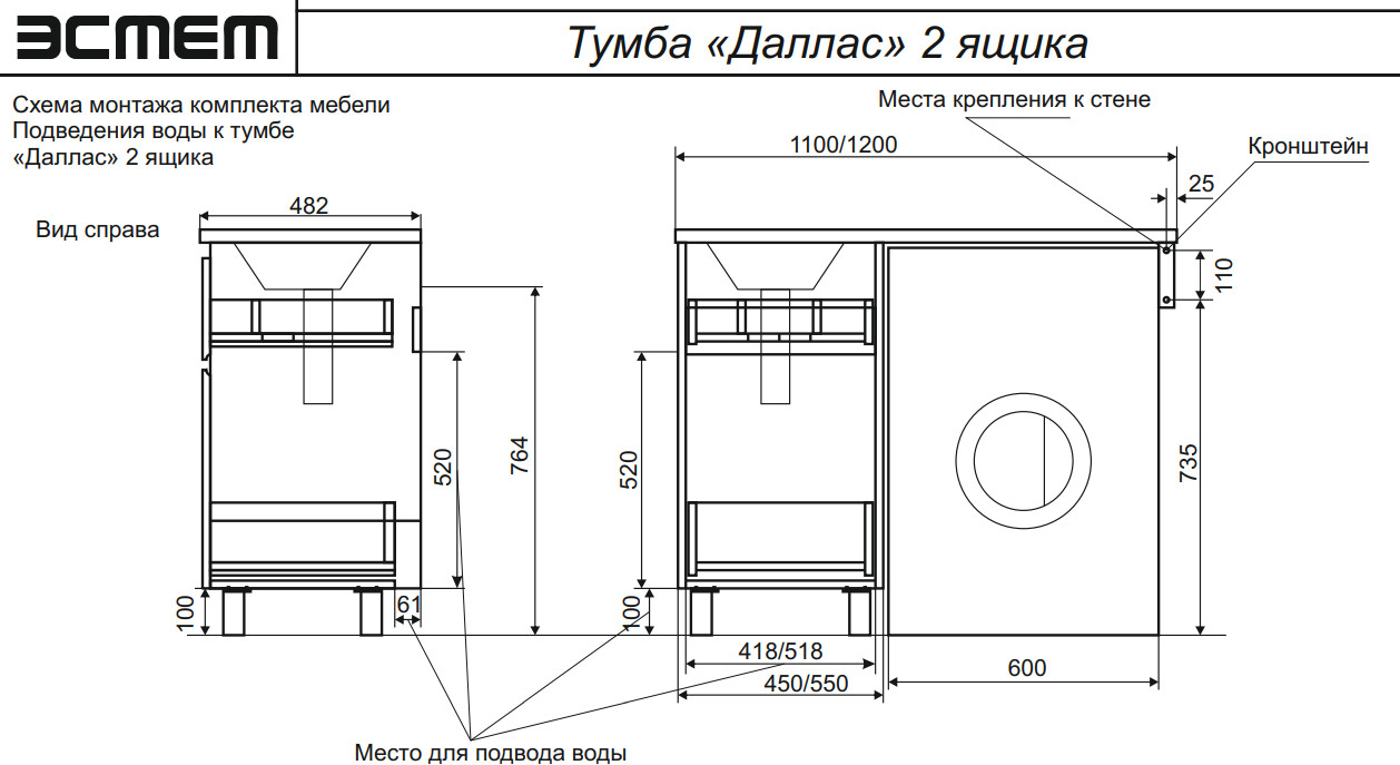 Тумба с раковиной Dallas Luxe 1100 напольная 2 ящика левая