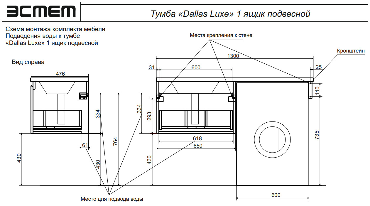- Тумба с раковиной Dallas Luxe 1300 навесная 1 ящик левая
