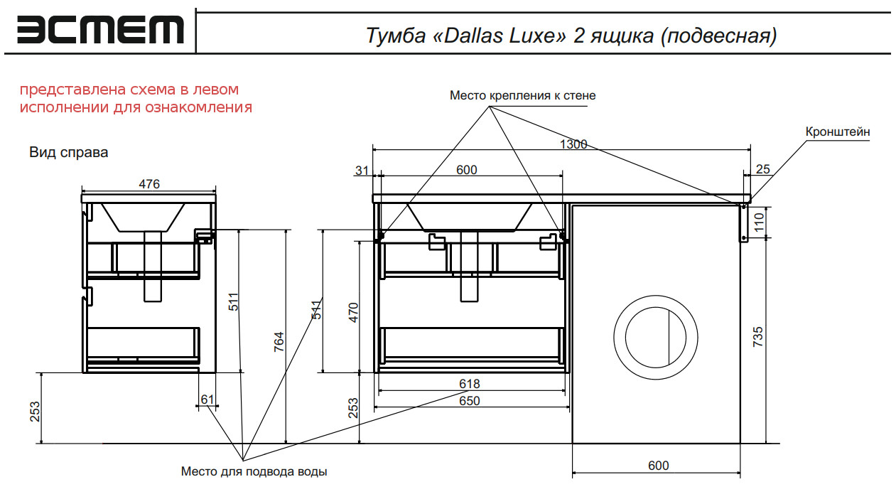 - Тумба с раковиной Dallas Luxe 1300 навесная 2 ящика правая