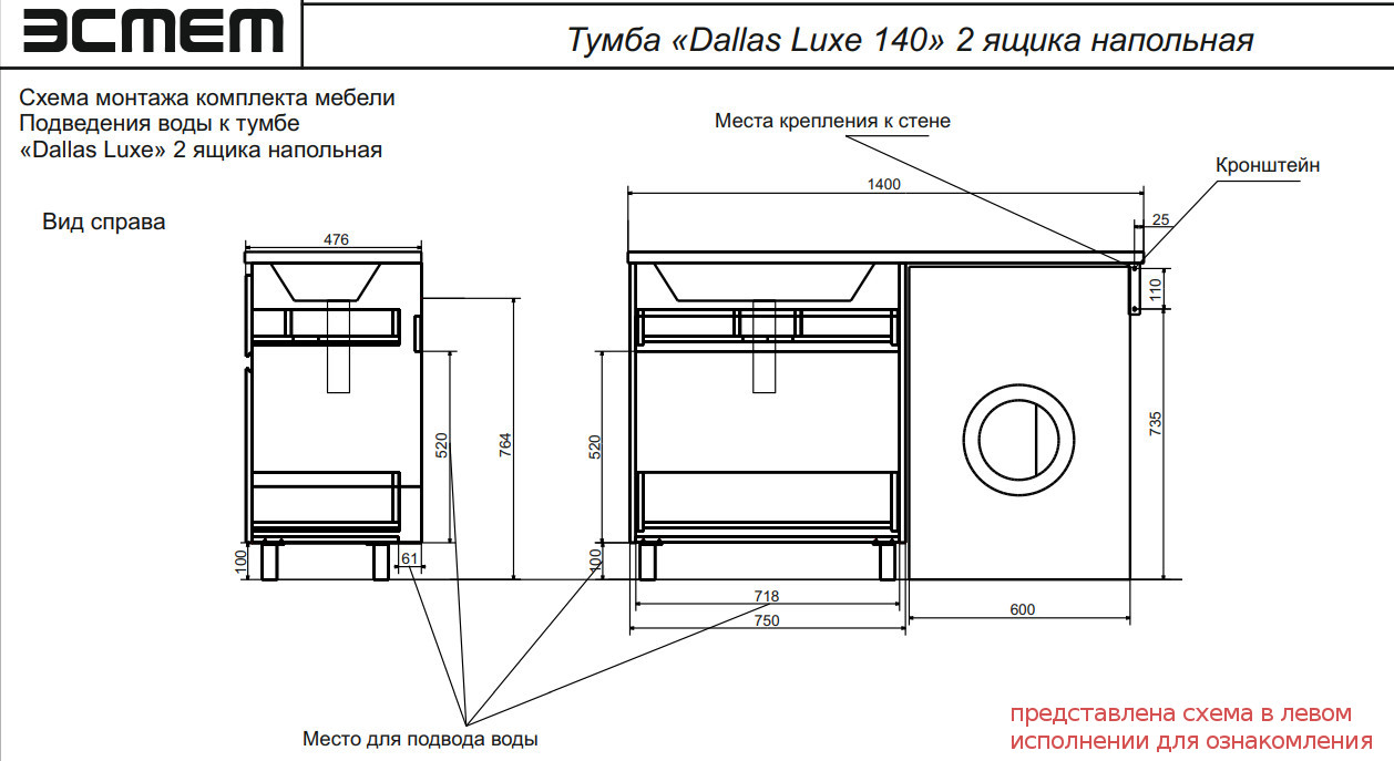 - Тумба с раковиной Dallas Luxe 1400 напольная 2 ящика правая