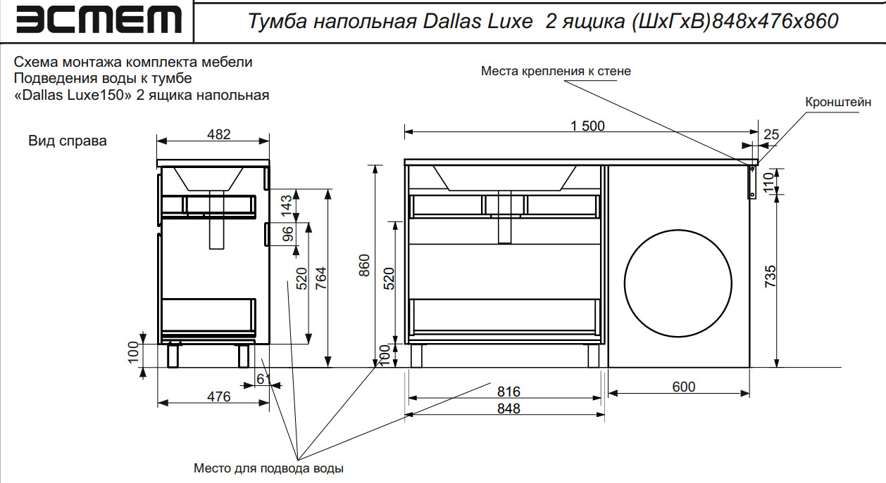 - Тумба с раковиной Dallas Luxe 1500 напольная 2 ящика левая