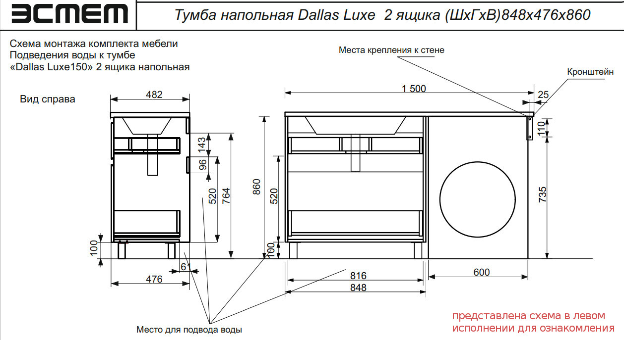 - Тумба с раковиной Dallas Luxe 1500 напольная 2 ящика правая