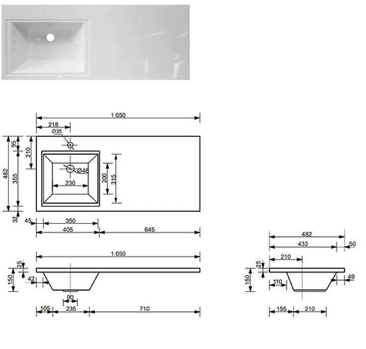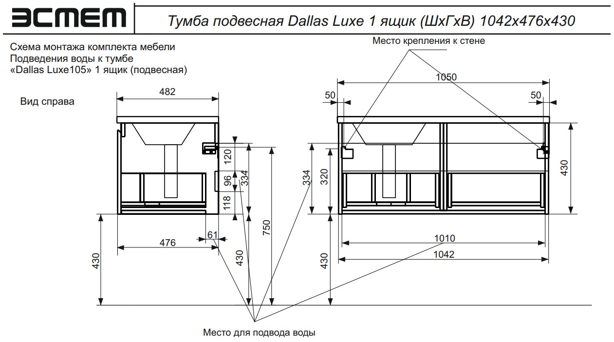 - Тумба с раковиной слева Dallas Luxe 1050 навесная 1 длинный ящик