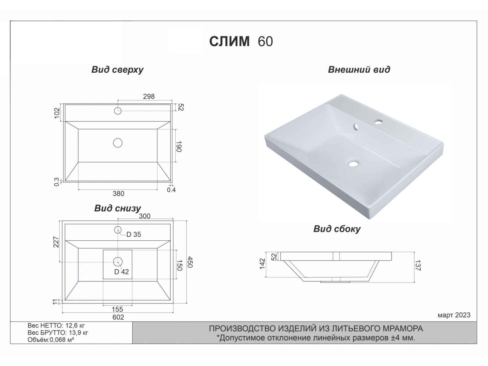 Тумба Сохо 60 напольная 2 ящика раковина Слим 60
