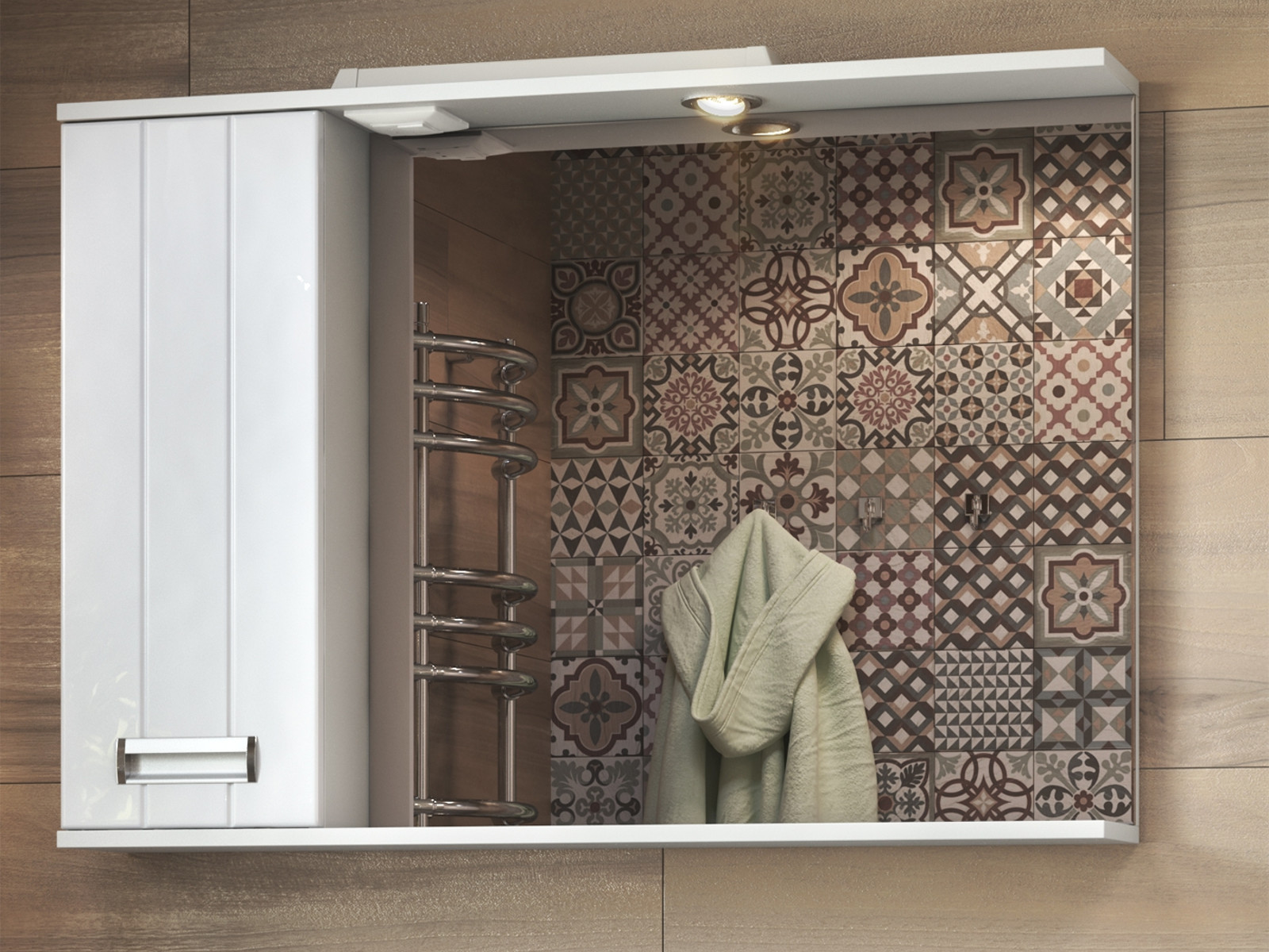 Оснащение: 1 дверца; 2 полки ЛДСП, 1 светодиодный светильник, включатель с розеткой; ручка врезная металлическая хромированная.