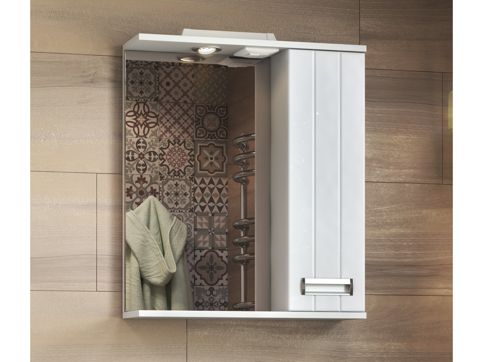 Оснащение: 1 дверца; 2 полки ЛДСП, 1 светодиодный светильник, включатель с розеткой; ручка врезная металлическая хромированная.