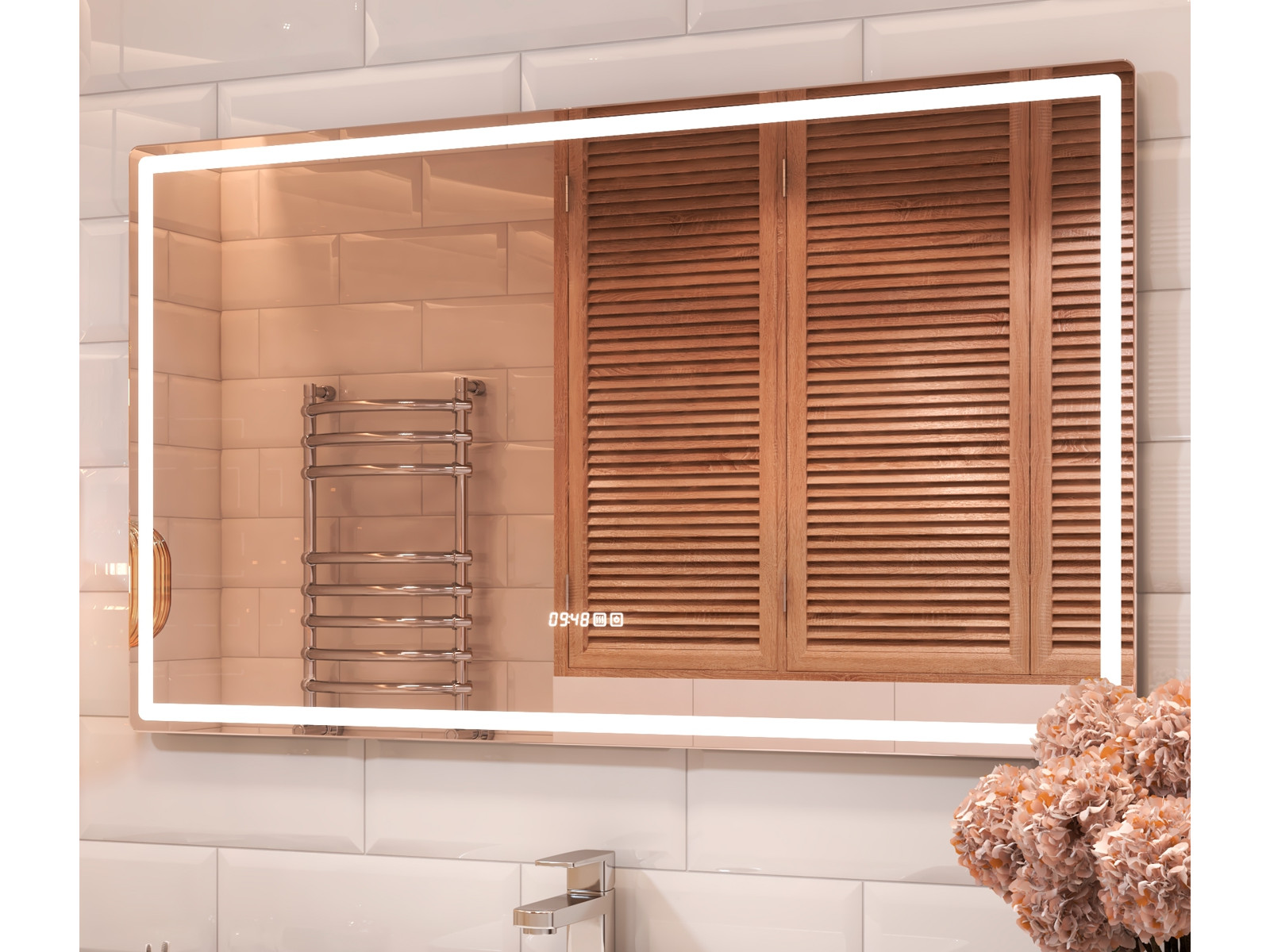 Оснащение: LED подсветка по периметру, сенсорное управление, часы, функция