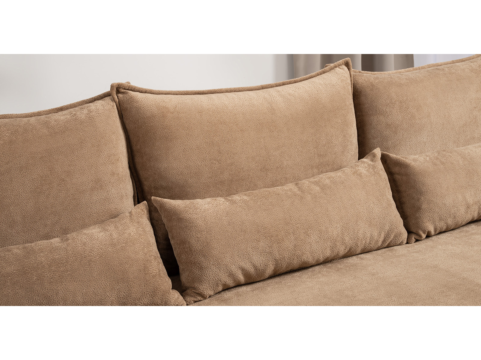 Спинка с тремя приспинными подушками. Две подушки трапецивидной формы, центральная квадратной формы на молнии, по трем сторонам которых проложена отделочная строчка на 1,2 см. По контуру боковин проложен декоративный кант на 1,2 см из основной ткани. Кант проходит по центру передней части боковины, а по внутренней верхней части сборка.