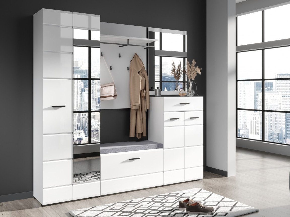 - Глянцевые белые фасады High Gloss из МДФ и зеркало в полный рост наполняют помещение светом, делают его воздушнее.