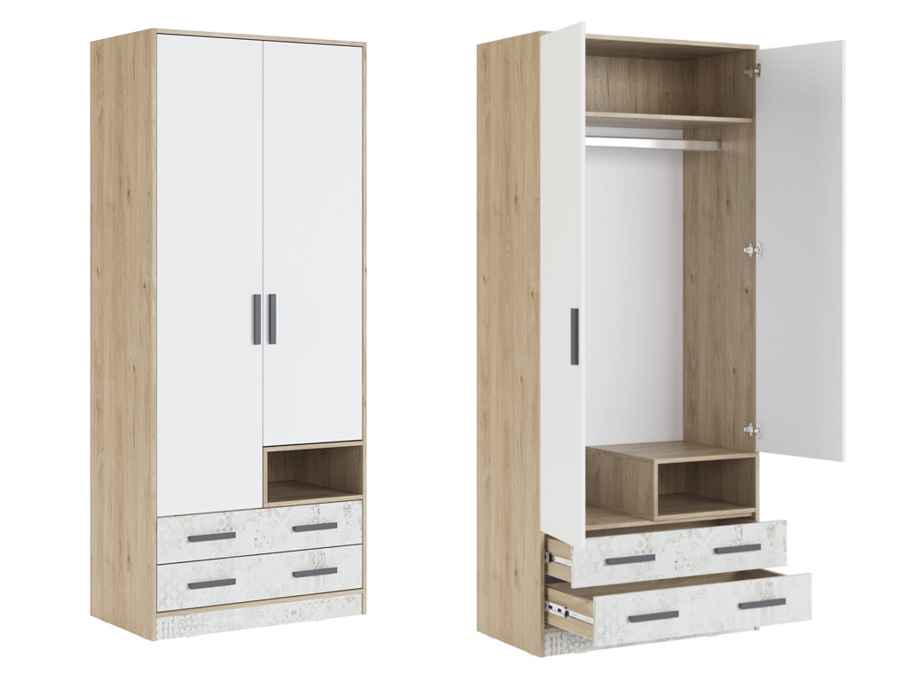 - Шкаф имеет два распашных фасада, два выдвижных ящика на шариковых направляющих полного выдвижения и открытую нишу.