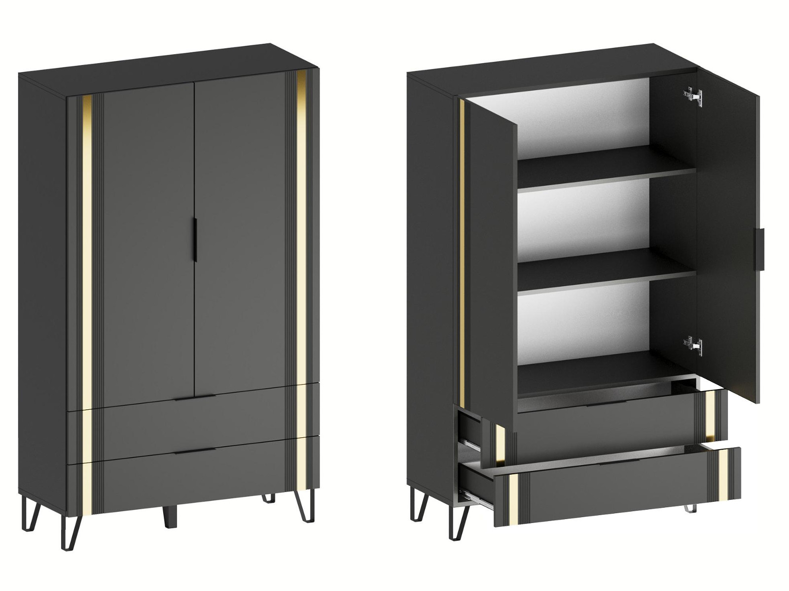 - Фасады из МДФ с оригинальной фрезеровкой покрыты суперматовой пленкой с эффектом Soft Touch в цветах Графит и Milk.