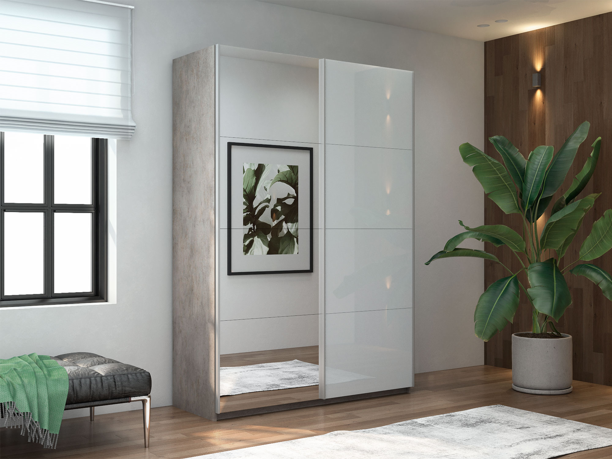 - Шкаф-купе Прайм 2-х дверный 1200 Зеркало/Стекло Белое Бетон