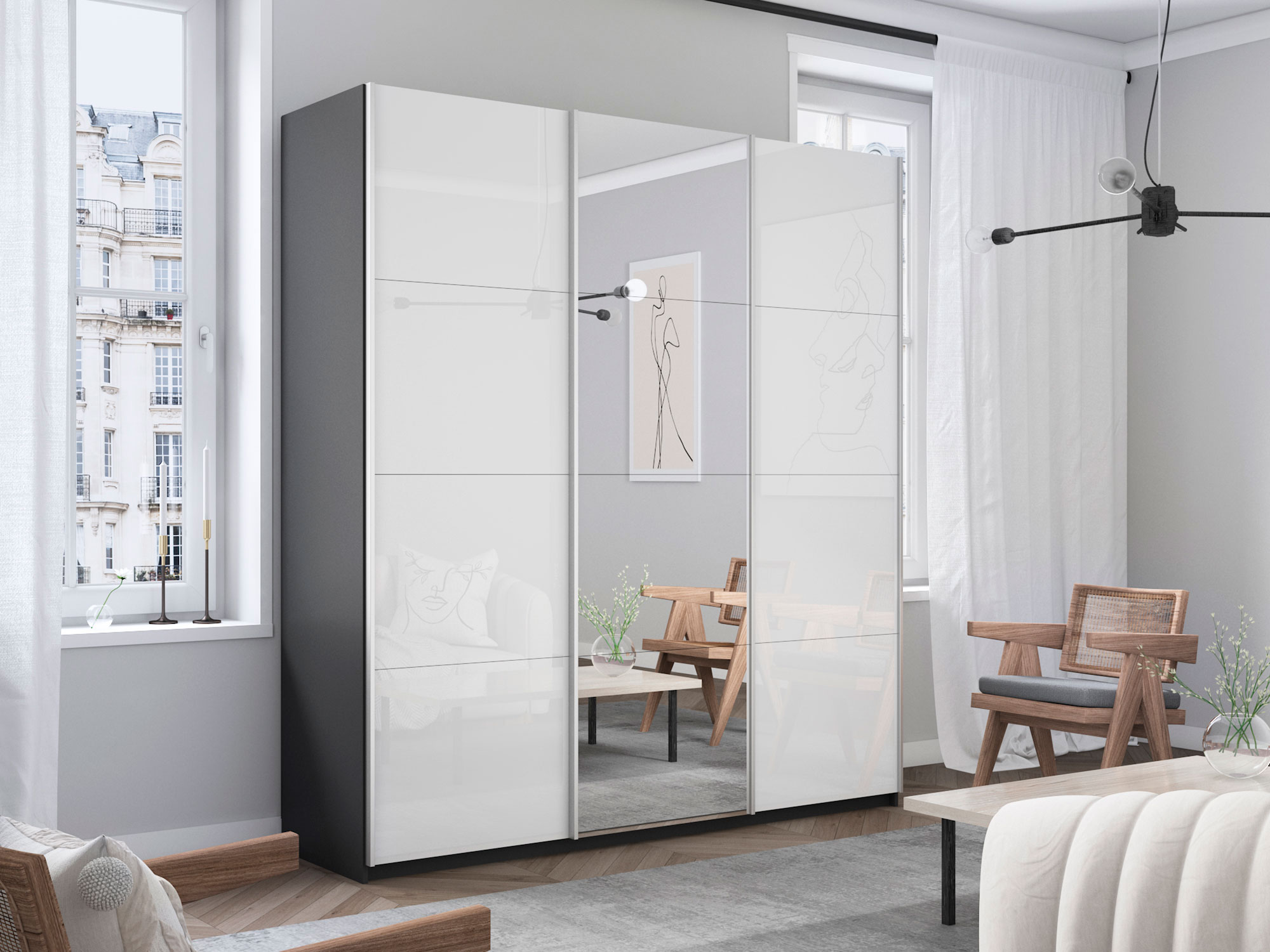 - Шкаф-купе Прайм 3-х дверный 2100 два Стекла Белые/Зеркало Серый Диамант
