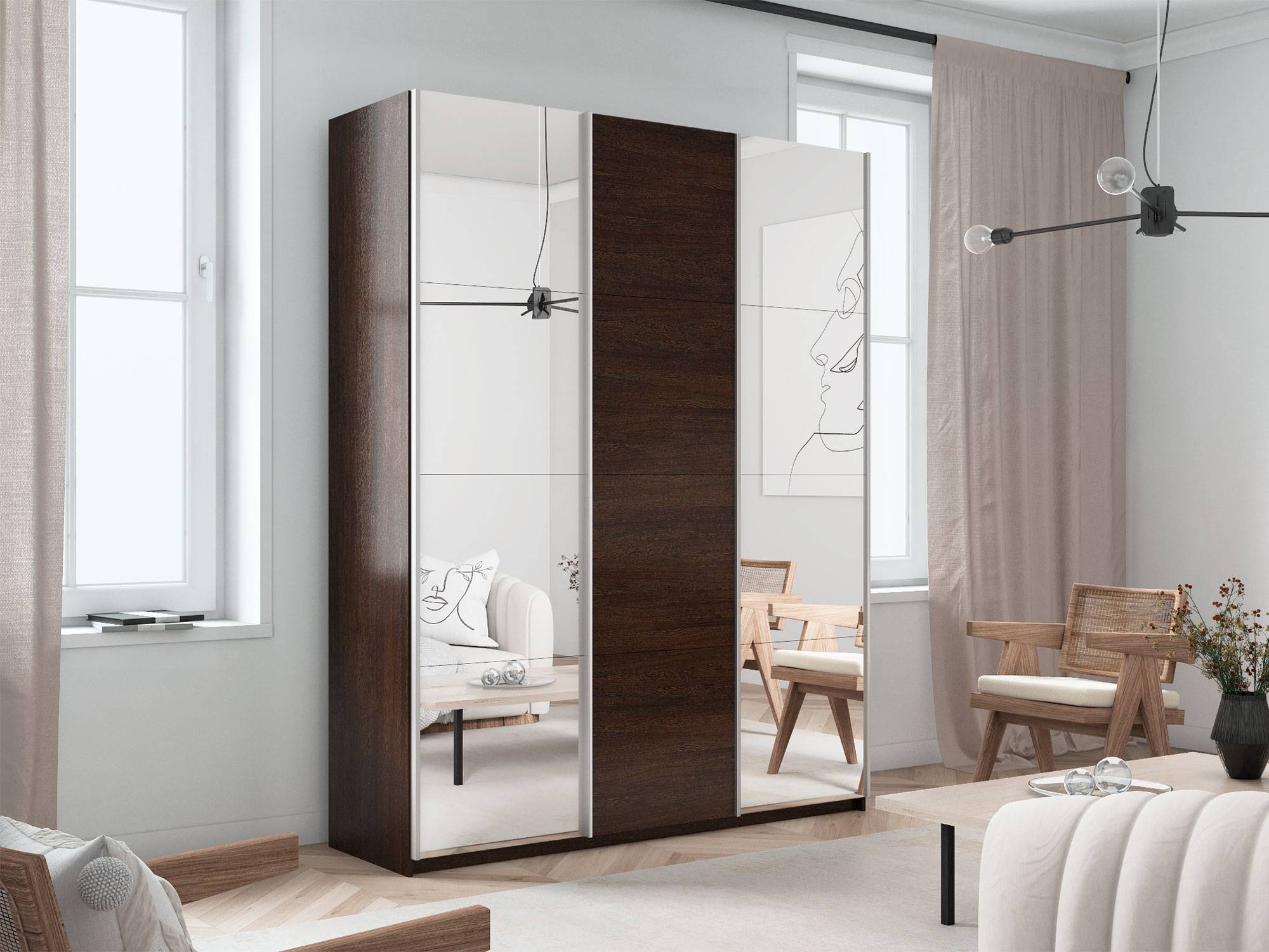- Шкаф-купе Прайм 3-х дверный 2100 два Зеркала/ДСП Венге