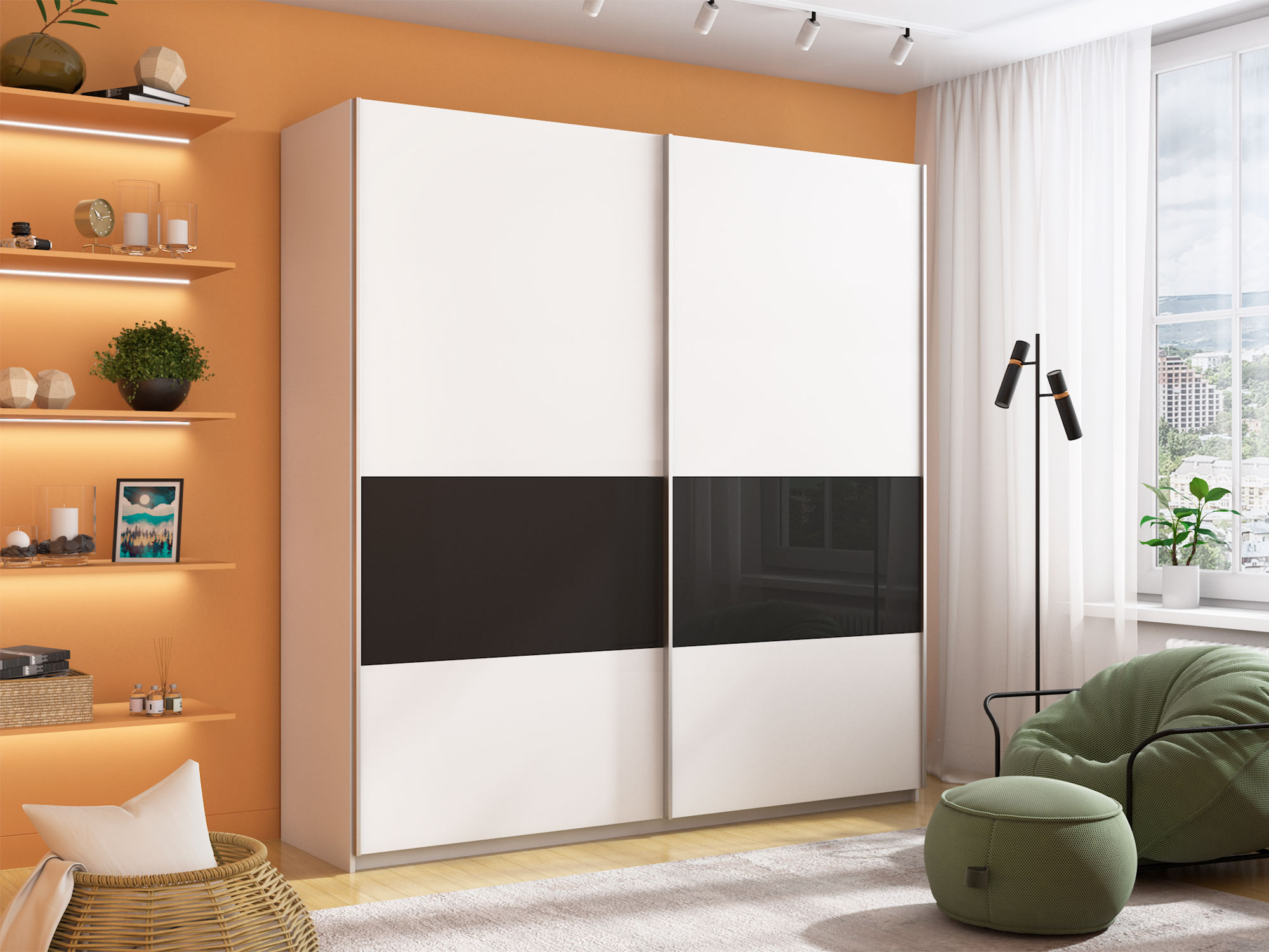 Шкаф-купе Прайм Широкий 2-х дверный ДСП/вставки Стекло Черное Белый Снег