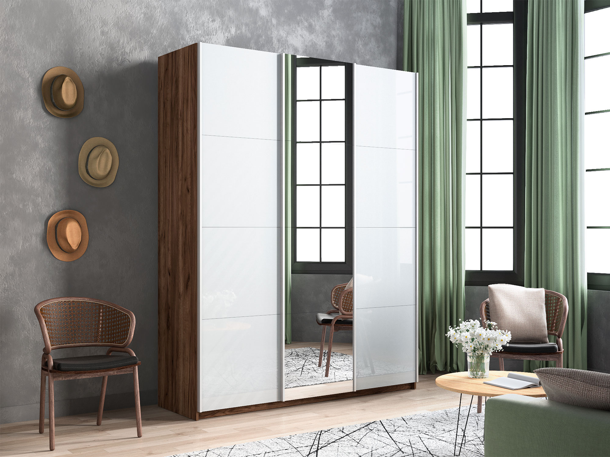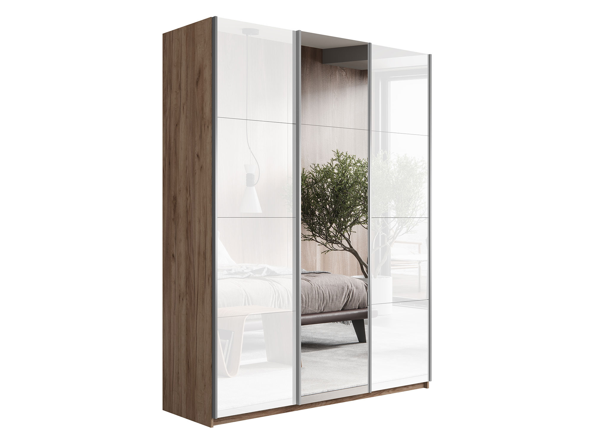 Шкаф-купе Прайм Широкий 3-х дверный два белых стекла/зеркало Крафт табачный