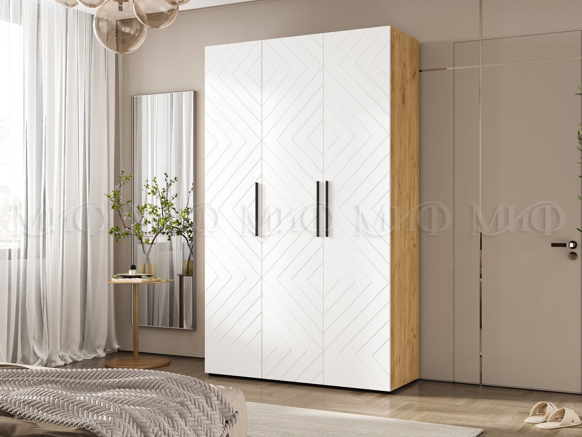 - Шкаф трехстворчатый (1350) Флэш Браш Вайт, Дуб Крафт
