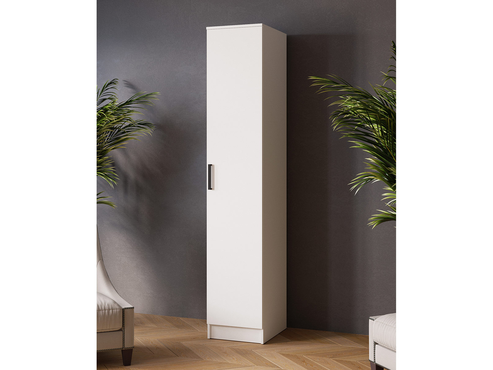 Пенал Ларс имеет два варианта внутреннего наполнения - полки или штанга. Фурнитура: опоры – подпятники пластиковые, черные. Ручки пластиковые, черные.