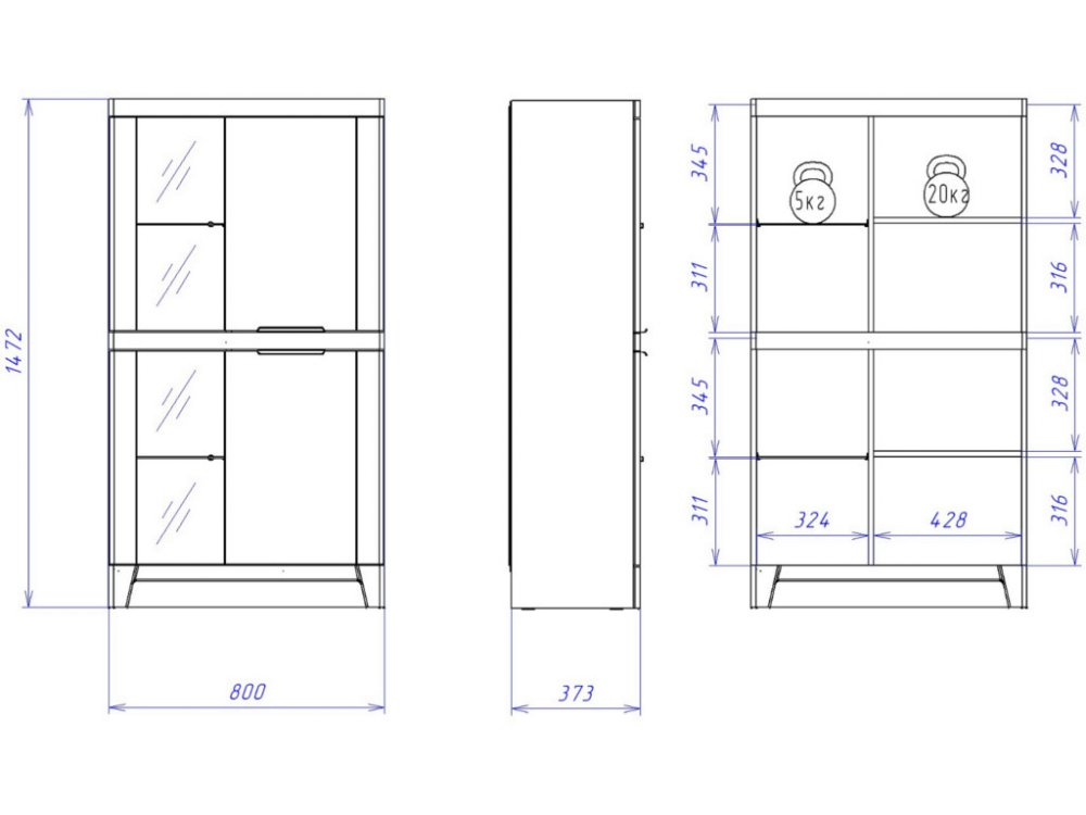 Пенал низкий Юта укомплектован полками: 2- стекло (максимальная нагрузка на полку стекло - 5кг), 2 - ЛДСП (максимальная нагрузка на полку - 15кг). Материал 2-х фасадов - стекло (планибель).