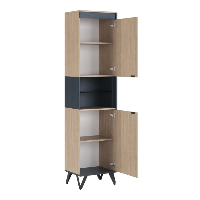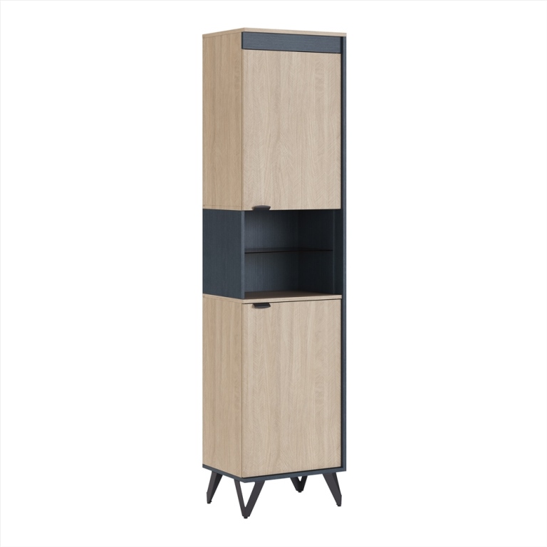 Возможна левосторонная и правосторонняя сборка. Толщина ЛДСП 16 мм. Ручки накладные (торцевые), также как и опоры изготовлены из металла, окрашенного полимерной антисколовой красной черного цвета. Ручки в процессе сборки можно крепить к фасаду как в месте фабричного кернения, так и по середине. Шкаф узкий имеет открытую нишу со стеклянной полкой цвета "бронза" тонированной в массе. Имеет два распашных фасада. Для крепления фасадов используются европейские четырехшарнирные петли фирмы "Titus" (Словения) с плавным закрыванием. Имеет две съемные полки.