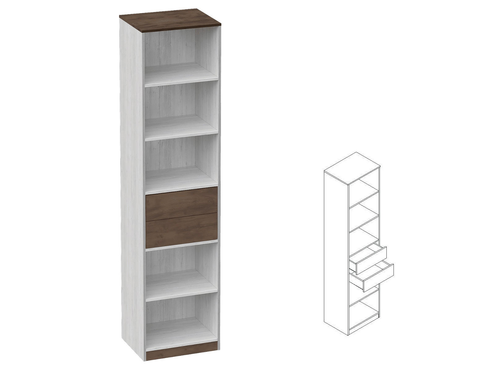 Четыре открытые полки и два выдвижных ящика на шариковых направляющих