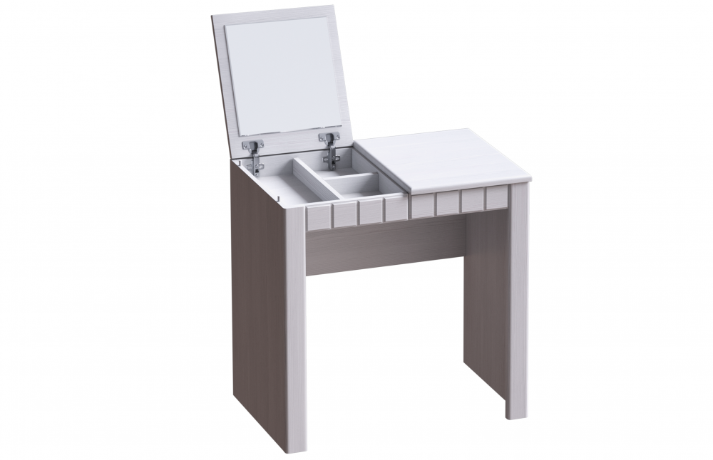 Туалетный стол разделён на две части: - справа под столешницей находится выдвижной ящик на шариковых направляющих; - слева под столешницей находятся три ниши для хранения туалетных аксессуаров. Сама столешница открывается вверх. На ней расположено зеркало.