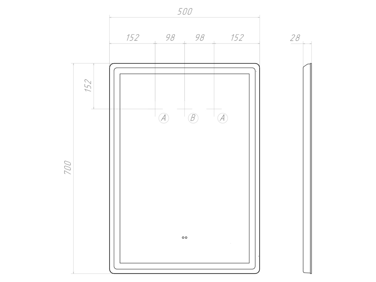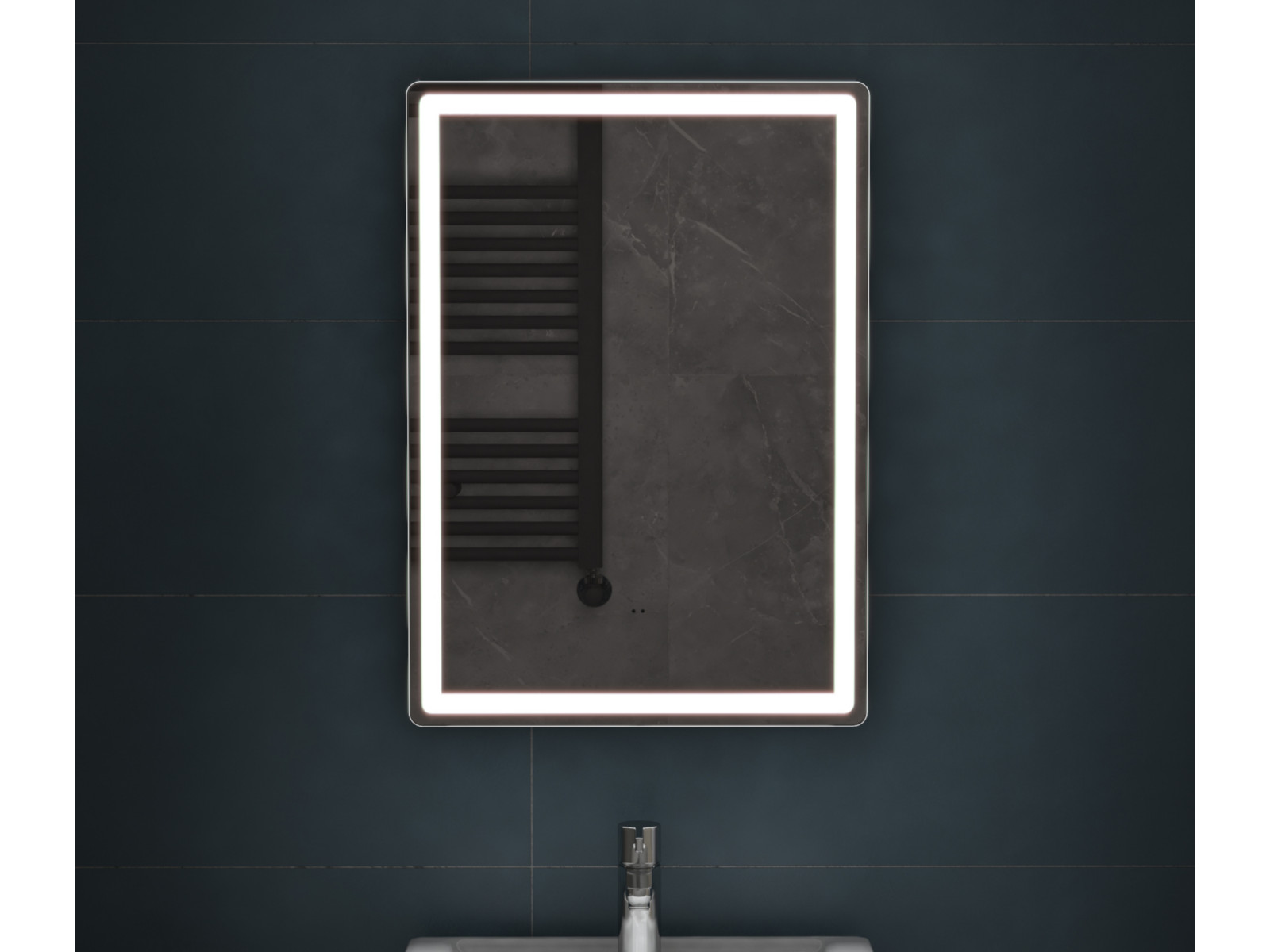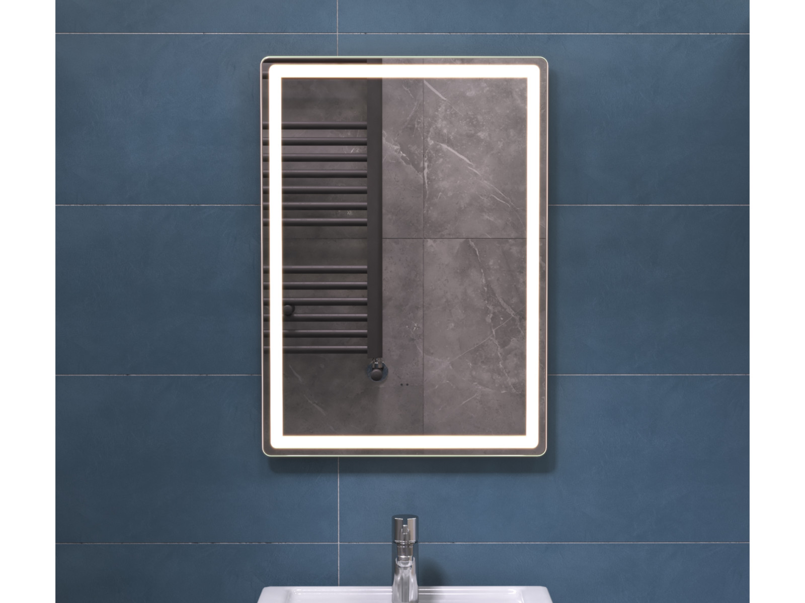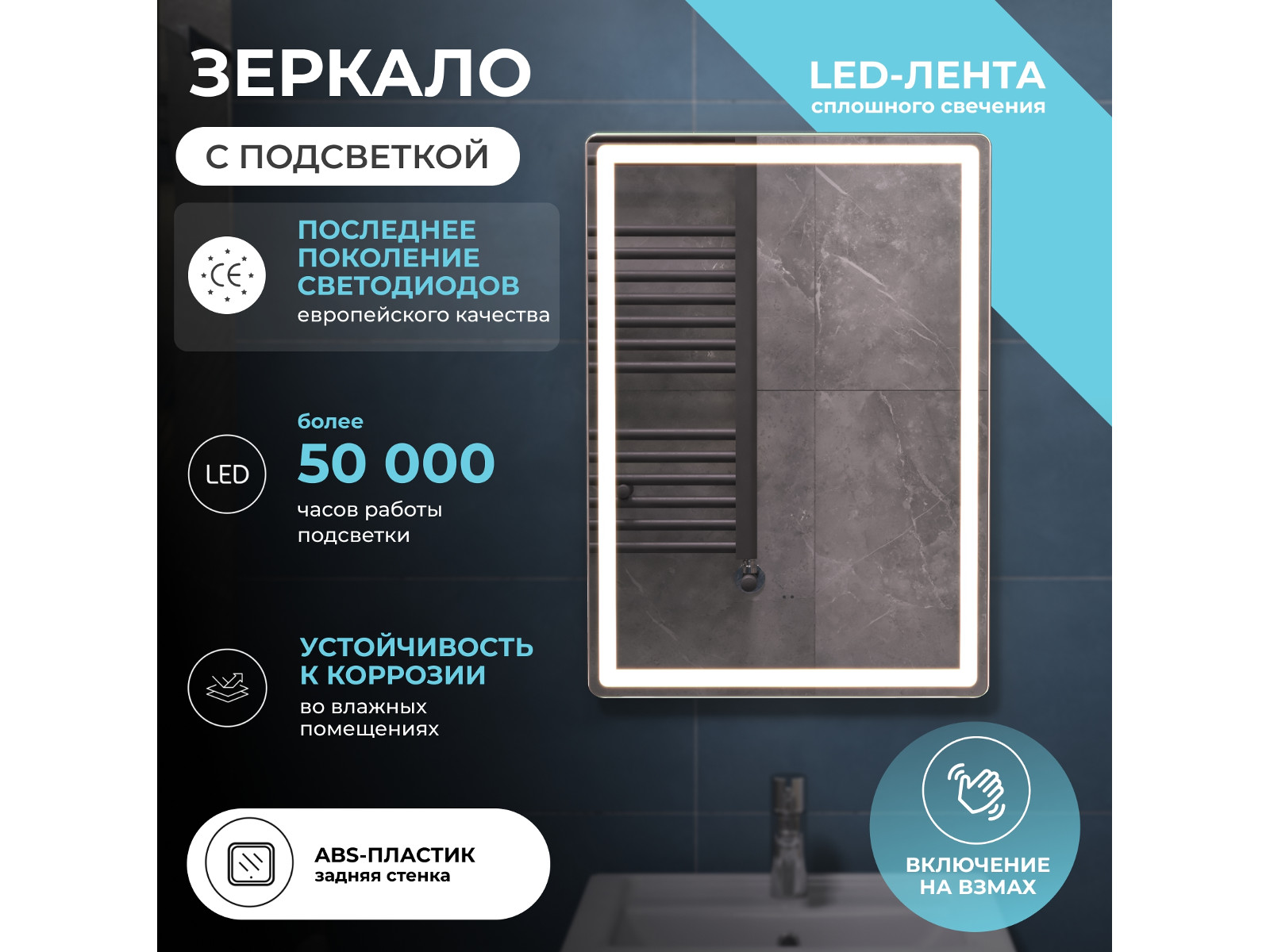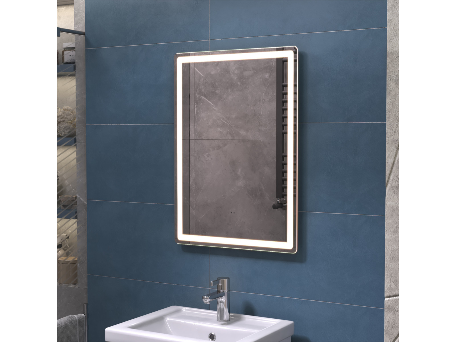 Подсветка фронтальная по периметру, с цветовой температурой 5000К – нейтральный белый, управление подсветкой бесконтактный выключатель «на взмах»